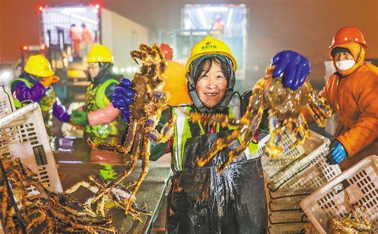 2月14日,山东省荣成市石岛科罚区石岛新港港口,责任主谈主员在分拣君王蟹。该港口绽开联检绿色通谈,保险生鲜货物安全高效入境,供应春节市集。