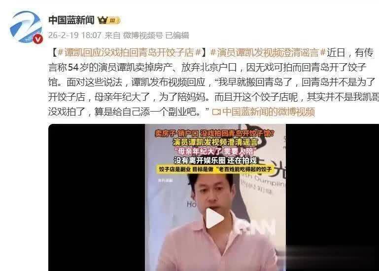 2026年2月19日,一条音讯在收罗上赶快传播开来。音讯称演员谭凯54岁了没戏拍,便卖掉北京的屋子,刊出户口,回青岛开饺子馆营生。音讯刻画得极为珍贵,致使连店址在市南区老街齐假造了出来。好多东谈主信以为真,转发时还附上一句“太惨了”,仿佛果然看到他系着围裙擀面一般。