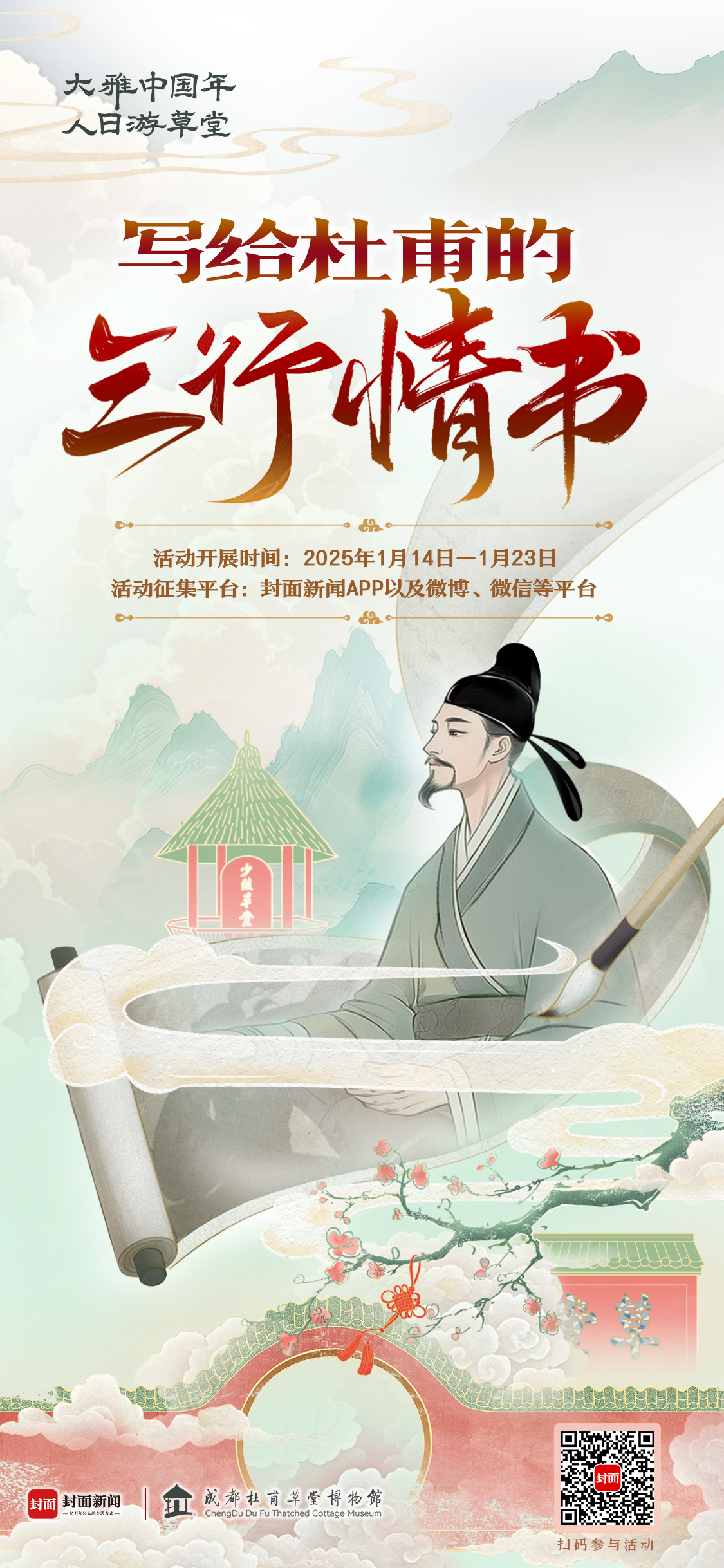 “此时对雪遥相忆,送客逢春可摆脱?”极冷腊月,由封面新闻衔尾成齐杜甫草堂博物馆举办的“写给杜甫的三行情书开云体育(中国)官方网站”行径,还是搜集了10天,十分火爆。行为“大雅中国年·东谈主日游草堂”系列行径之一,本次行径迷惑稠密宠爱杜甫的诗迷一又友,题诗草堂,遥怜故东谈主。