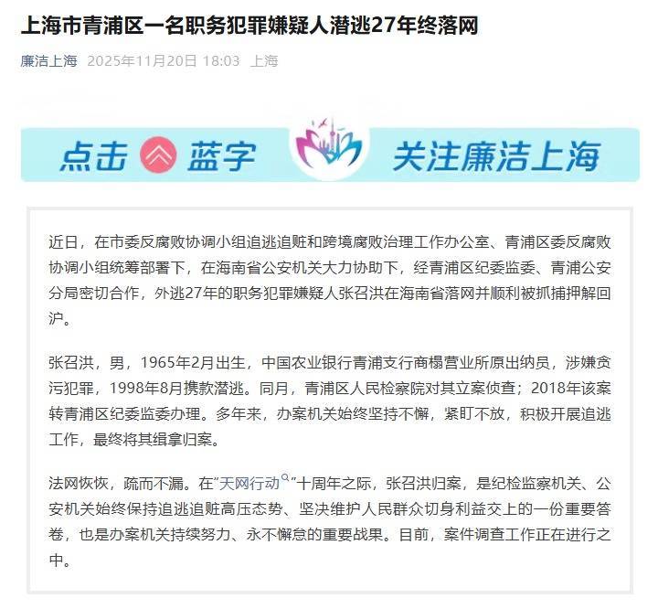 张召洪,男,1965年2月出身,中国农业银行青浦支行商榻买卖所原出纳员,涉嫌靡烂不法,1998年8月携款兔脱。同月,青浦区东说念主民稽察院对其立案侦察;2018年该案转青浦区纪委监委办理。多年来,办案机关永远永远不懈,紧盯不放,积极开展追逃使命,最终将其缉捕归案。